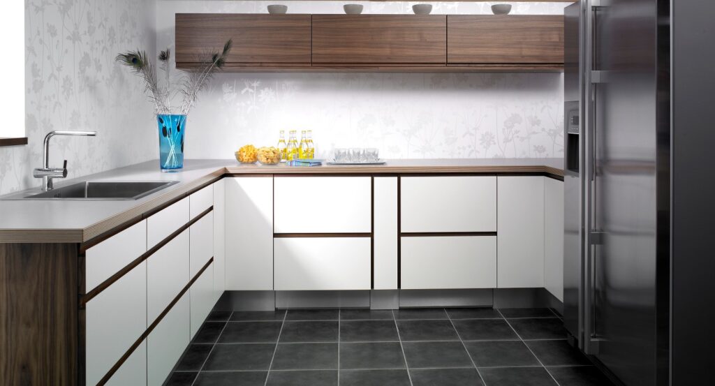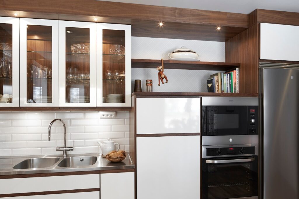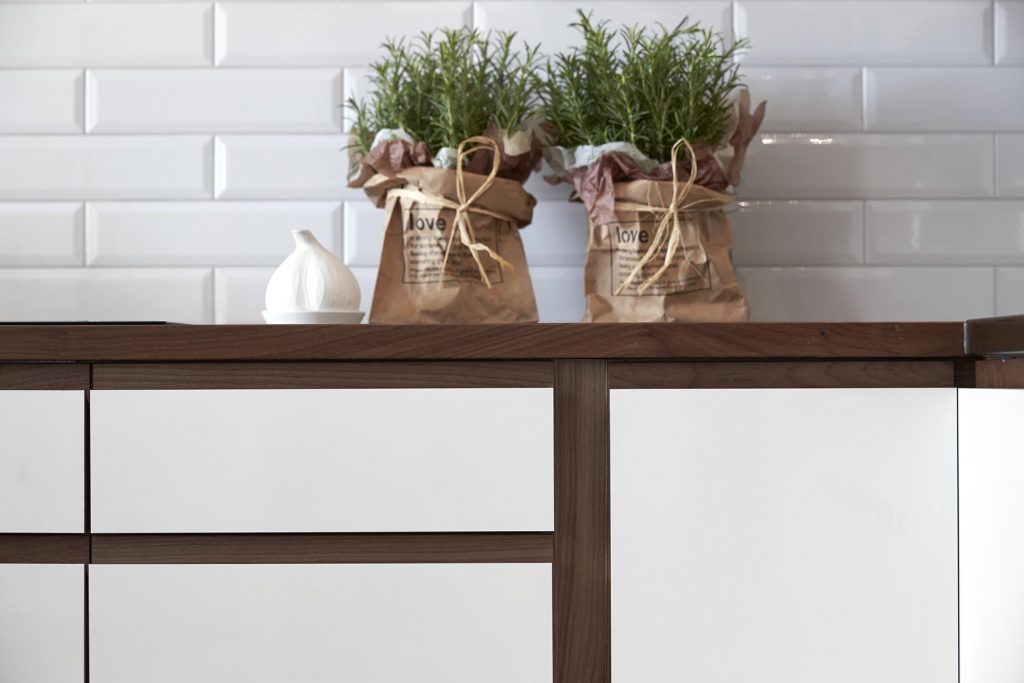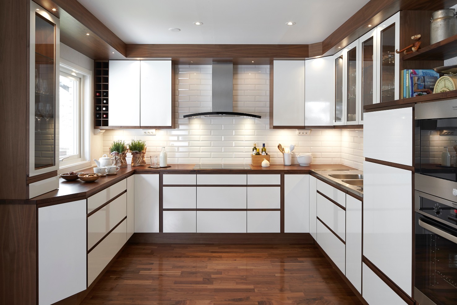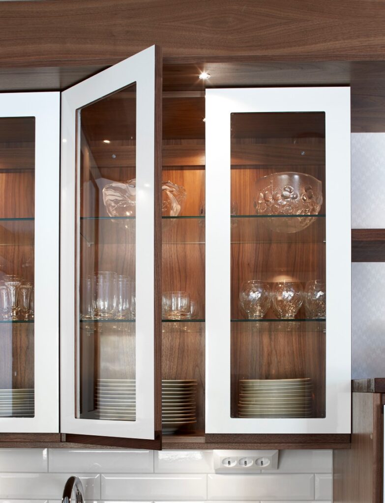 Option Grepp ger ett funktionellt kök med fantastiska möjligheter att skapa sin egen stil. Här har man valt kontrasten mellan det vita, högblanka och den varma vackra valnöten. Laminaten går att få i flera olika färger och trälisten finns även i ek.