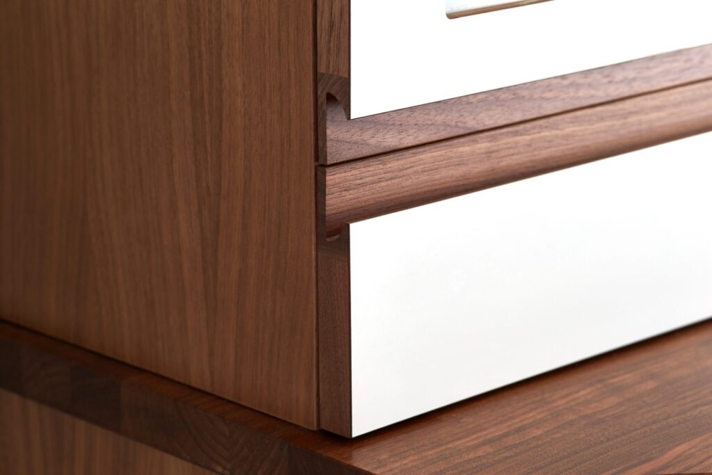 Lucka: Option Grepp, vit högblank med massiv valnötslist
